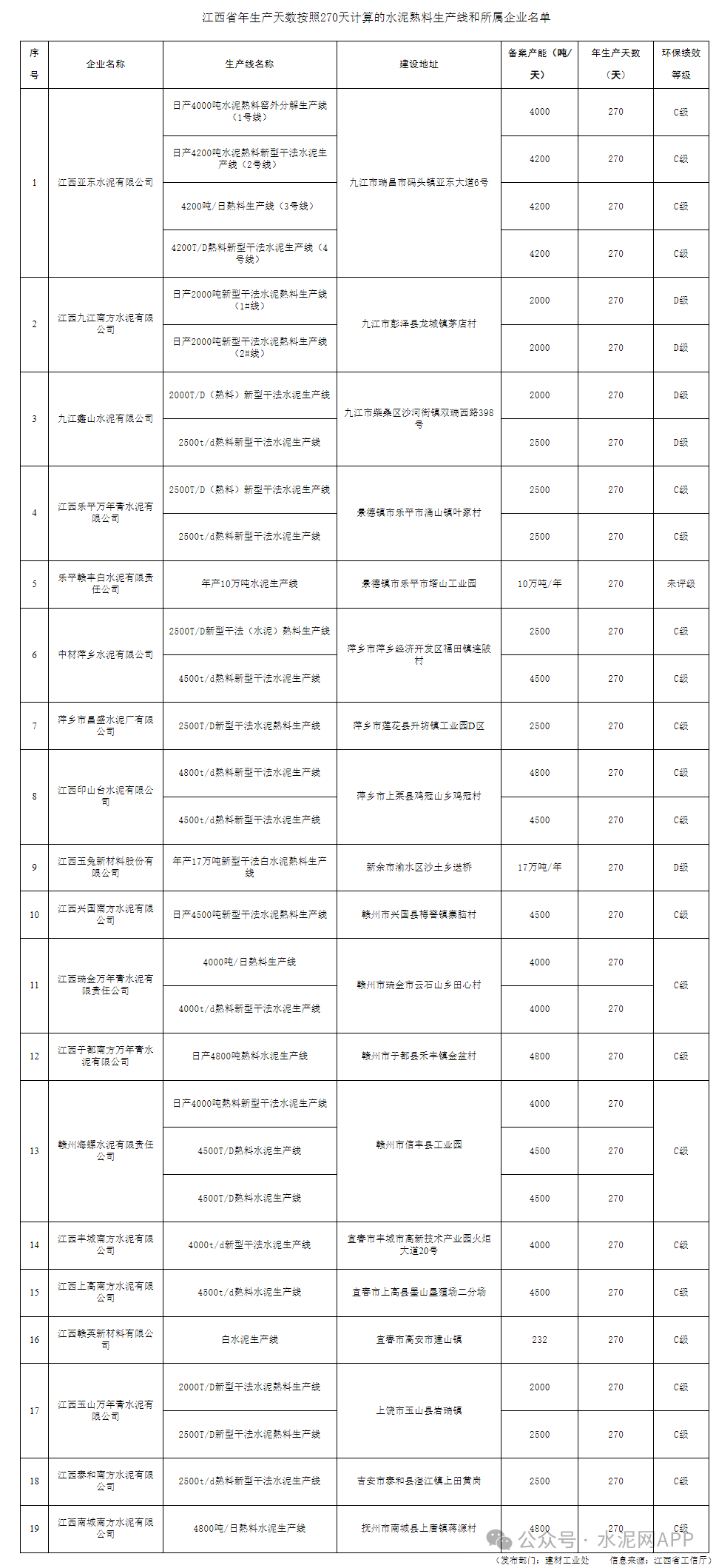 近日,江西工信廳發(fā)布“關(guān)于年生產(chǎn)時(shí)間按照270天計(jì)算的水泥熟料生產(chǎn)線和所屬企業(yè)名單的公示”。